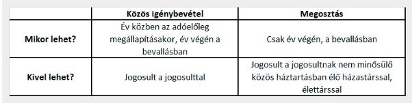 − amelyben a családi kedvezményt más jogosulttal közösen érvényesíti A közös igénybevétel és a megosztás fontosabb szabályait a következő tábla foglalja össze: