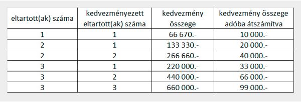 Ez a gyakorlatban azt jelenti, hogy a jogosultsági hónaponként igénybe vehető családi kedvezmény összege (családi kedvezmény keret) az eltartottak és kedvezményezett eltartottak számától függően a következők szerint alakul – lásd táblázat: